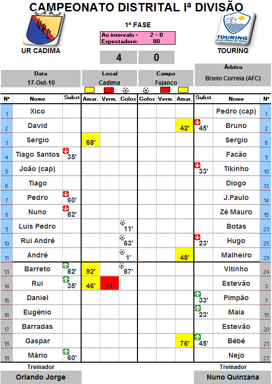 No inicio do segundo tempo a equipa visitante esgotou as substituições apostando tudo no ataque enquanto a equipa da casa mantinha a sua estrutura que se mostrava segura e eficaz. O jogo no segundo tempo foi mais jogado no meio campo ofensivo do Touring mas sem criar verdadeiras situações de perigo para os locais, aproveitando a subida da equipa visitante o Cadima tentava no contra ataque “matar o jogo. O jogo era agora de grande atitude por parte das equipas com o Cadima a não facilitar na defensiva por isso algumas vezes se viu a bola em demasia pelo ar, quando esta chegava ao solo a mobilidade dos homens da casa fazia a diferença e incomodavam a baliza forasteira. Aos 63 minutos aconteceu o melhor do jogo, o Touring tentava sair uma vez mais para o ataque e colocou a bola em profundidade na direita tentando servir Sérgio, David consegue antecipação, “galga” terreno rapidamente quando chega à zona defensiva dos homens da Praia de Mira cruza com conta, peso e medida para a área onde aparece Rui André de cabeça a fazer um grande e tranquilizante golo. Após o terceiro golo o jogo ficou “quebrado” e quase sentenciado, o futebol era agora mais com o coração do que com a cabeça, as forças também iam faltando prejudicando acção dos atletas. Até final o Touring ainda teve uma ou duas situações em que poderia ter reduzido a desvantagem mas os seus dianteiros estavam em dia não, quem não marca geralmente sofre e o ditado voltou a funcionar, João Barreto após alguns minutos de entrar na partida finalizou de cabeça com mestria um canto marcado por David fechando a contagem final com um bonito golo e um prémio sem dúvida merecido para o atleta. Pouco depois o apito final com a vitória a sorrir aos homens da casa que foram extremamente eficazes e organizados, o conjunto funcionou muito bem, vitória valorizada pela qualidade do adversário que mesmo em desvantagem considerável tentou até ao apito final alterar os acontecimentos. Os números finais podem ser algo exagerados pelo que se produziu em campo mas premeia a equipa da casa que soube sofrer quando foi preciso e libertar-se nas alturas certas. Arbitragem sem influência no resultado mas com demasiados equívocos!!!